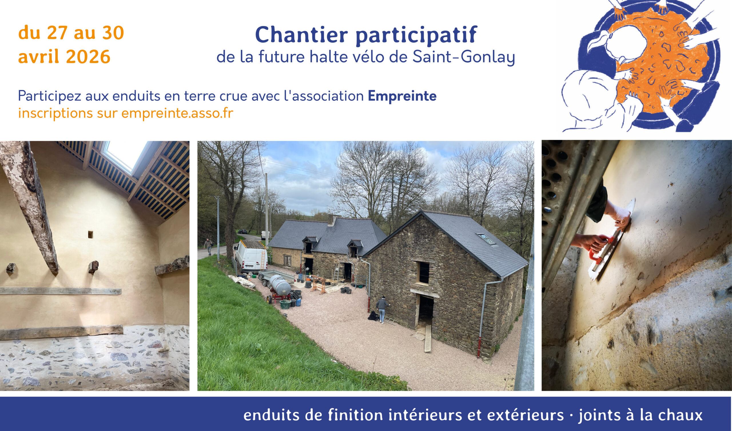 L’association Empreinte et la commune de Saint-Gonlay vous invitent à mettre les mains dans la terre pour un chantier participatif autour des enduits en terre crue (finitions intérieures et extérieures, bouse de vache, joints pierre à la chaux), dans le cadre de la restauration de l’ancien moulin du Pont Jean en halte vélo.