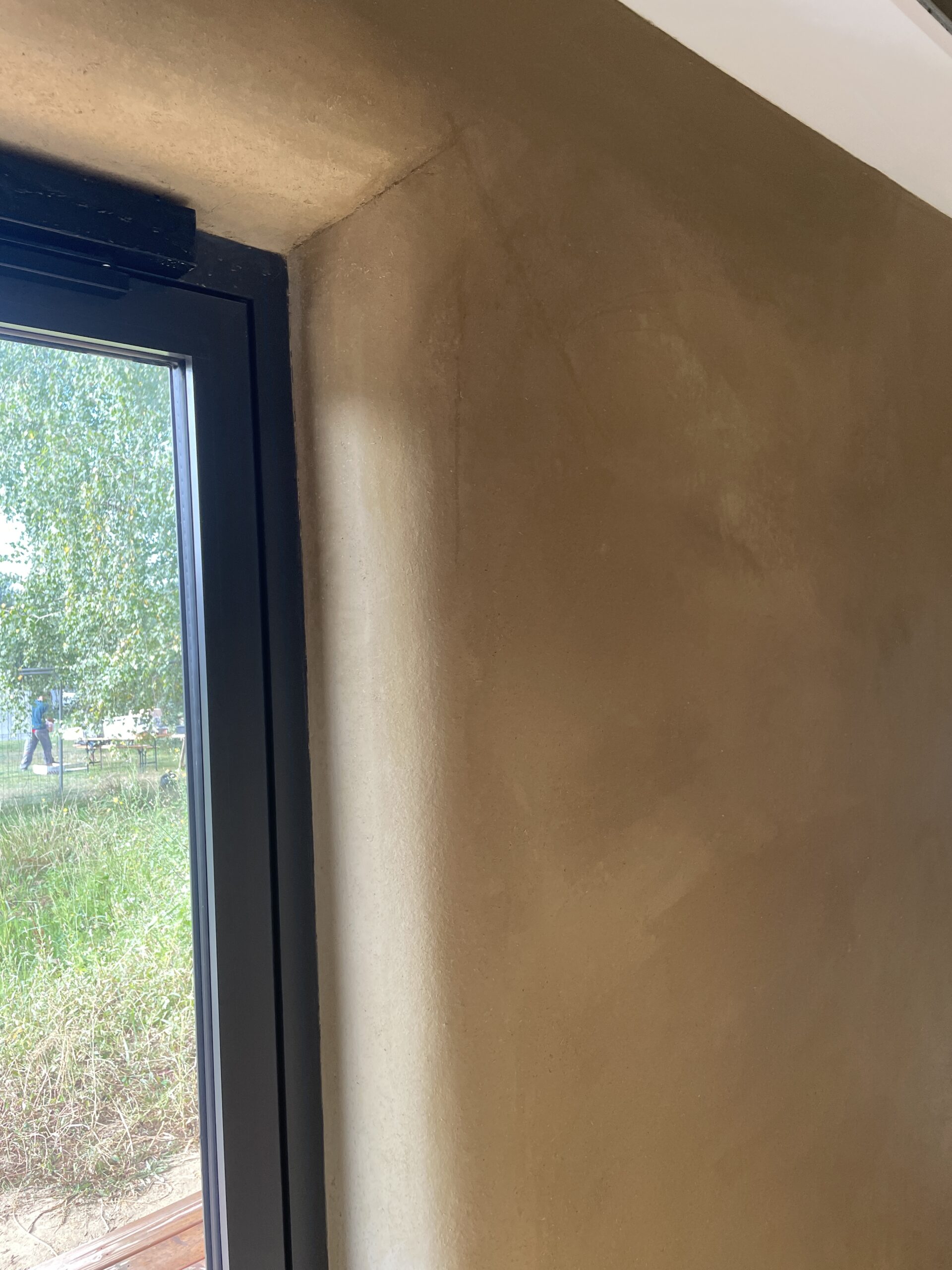 La finition a été réalisée en ajoutant environ 10% de bouse de vache (certifiée bio, récupérée dans la commune également). La bouse de vache présente des propriétés stabilisantes rendant l’enduit plus résistant.